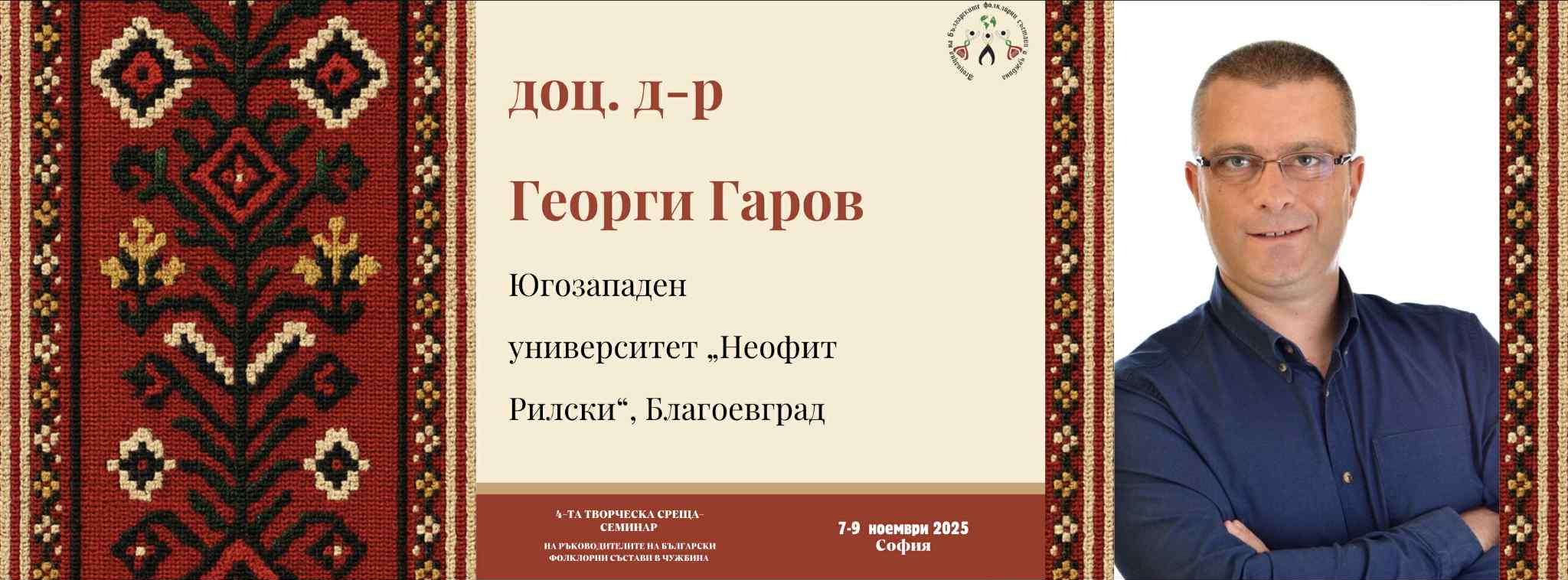 В рамките на Четвъртата творческа среща–семинар, доц. д-р Георги Гаров ще представи задълбочен поглед върху танцовите и музикални специфики на Пиринска област, както и практическа част, насочена към хореографи и ръководители на състави.